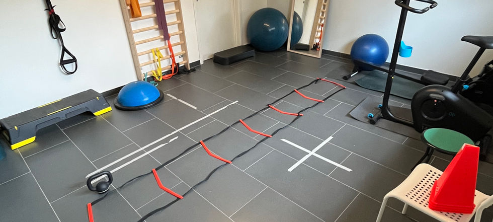 Découvrez notre équipement complet, incluant un banc de musculation, un rameur, un vélo, TRX, BOSU, trampoline, médecine ball, un tapis de cours et bien plus encore.